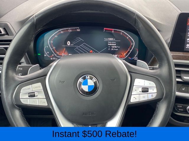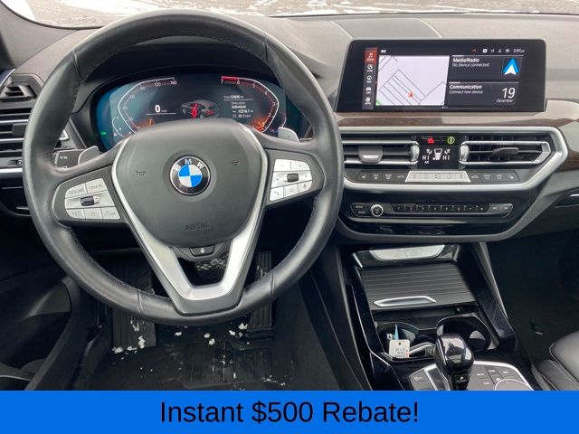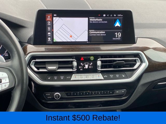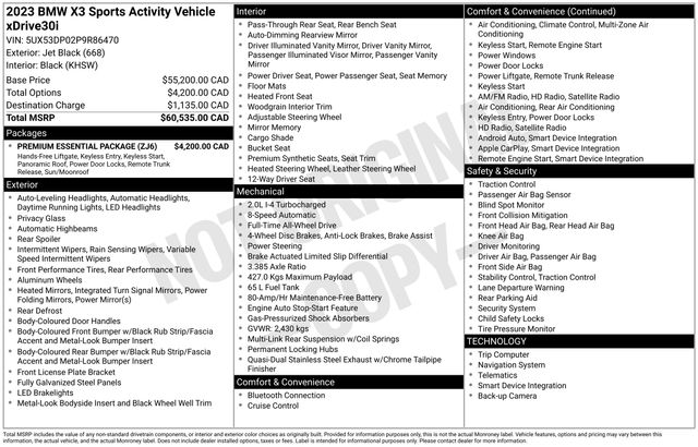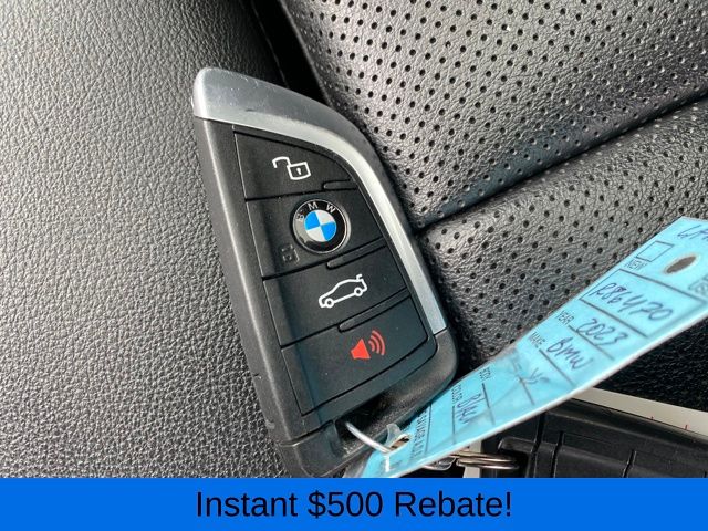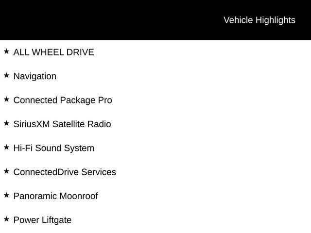 Apple CarPlay & Android Auto Compatibility, BMW Assist eCall, BMW TeleServices, Connected Package Pro, ConnectedDrive Services, Exterior Parking Camera Rear, Hi-Fi Sound System, Navigation, Panoramic Moonroof, Power Liftgate, SiriusXM Satellite Radio, Speed control, Wheels: 19" x 7.5" Y-Spoke (Style 693), 12 Speakers, 3.385 Axle Ratio, 4-Wheel Disc Brakes, ABS brakes, Air Conditioning, Alloy wheels, AM/FM Radio, AM/FM radio: SiriusXM, Auto High-beam Headlights, Auto-dimming door mirrors, Auto-dimming Rear-View mirror, Automatic temperature control, Brake assist, Bumpers: body-color, Delay-off headlights, Driver door bin, Driver vanity mirror, Dual front impact airbags, Dual front side impact airbags, Electronic Stability Control, Emergency communication system: BMW Assist eCall, Enhanced USB & Bluetooth w/Smartphone Integration, Four wheel independent suspension, Front anti-roll bar, Front Bucket Seats, Front Center Armrest, Front dual zone A/C, Front reading lights, Fully automatic headlights, Garage door transmitter, Genuine wood dashboard insert, Genuine wood door panel insert, Heated door mirrors, Illuminated entry, Knee airbag, Low tire pressure warning, Memory seat, Navigation System, Occupant sensing airbag, Outside temperature display, Overhead airbag, Panic alarm, Passenger door bin, Passenger vanity mirror, Perforated SensaTec Upholstery, Power door mirrors, Power driver seat, Power Front Seats, Power passenger seat, Power steering, Power windows, Radio data system, Rain sensing wipers, Rear air conditioning, Rear anti-roll bar, Rear reading lights, Rear seat center armrest, Rear window defroster, Rear window wiper, Remote keyless entry, Security system, Speed-sensing steering, Speed-Sensitive Wipers, Split folding rear seat, Spoiler, Sport Seats, Sport steering wheel, Steering wheel mounted audio controls, Tachometer, Telescoping steering wheel, Tilt steering wheel, Traction control, Trip computer, Turn signal indicator mirrors, Variably intermittent wipers, WiFi Hotspot, ALL WHEEL DRIVE, Apple CarPlay & Android Auto Compatibility, BMW Assist eCall, BMW TeleServices, Connected Package Pro, ConnectedDrive Services, Exterior Parking Camera Rear, Hi-Fi Sound System, Navigation, Panoramic Moonroof, Power Liftgate, SiriusXM Satellite Radio, Speed control, Wheels: 19" x 7.5" Y-Spoke (Style 693).