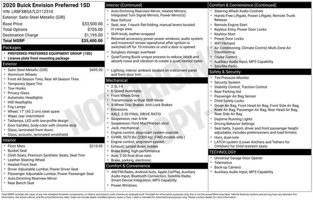 This 2020 Buick Envision Preferred is the perfect blend of style, comfort, and performance. With its sleek Satin Steel Metallic Gray exterior and a host of premium features, this Envision is sure to turn heads wherever you go.