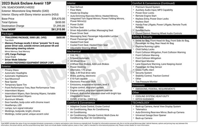 5000lbs Trailering Package, Heavy-Duty Cooling System, Hitch Guidance, Hitch Guidance w/Hitch View, Navigation System, 10 Speakers, 2nd Row Heated Outboard Seats, 3.49 Axle Ratio, 3rd row seats: split-bench, 4-Wheel Disc Brakes, 6-Way Power Front Passenger Seat Adjuster, 7-Passenger Seating, 8-Way Power Driver Seat Adjuster, ABS brakes, Air Conditioning, Alloy wheels, AM/FM radio: SiriusXM with 360L, Auto High-beam Headlights, Auto tilt-away steering wheel, Auto-dimming door mirrors, Auto-dimming Rear-View mirror, Automatic temperature control, Bose Performance-Enhanced 10-Speaker System, Brake assist, Bumpers: body-color, Compass, Delay-off headlights, Driver 4-Way Power Lumbar Seat Adjuster, Driver door bin, Driver vanity mirror, Dual front impact airbags, Dual front side impact airbags, Electronic Stability Control, Emergency communication system: OnStar and Buick connected services capable, Exterior Parking Camera Rear, Four wheel independent suspension, Front & Rear Park Assist, Front anti-roll bar, Front Bucket Seats, Front Center Armrest, Front dual zone A/C, Front Passenger 4-Way Power Lumbar Seat Adjuster, Front reading lights, Fully automatic headlights, Garage door transmitter, Heads-Up Display, Heated door mirrors, Heated Driver & Front Passenger Seats, Heated front seats, Heated rear seats, Heated steering wheel, Illuminated entry, Leather steering wheel, Low tire pressure warning, Memory Package, Memory seat, Occupant sensing airbag, Outside temperature display, Overhead airbag, Overhead console, Panic alarm, Passenger door bin, Passenger vanity mirror, Perforated Leather-Appointed Seat Trim, Power door mirrors, Power driver seat, Power Liftgate, Power moonroof, Power passenger seat, Power steering, Power windows, Preferred Equipment Group 1SP, Premium audio system: Buick Infotainment System, Radio data system, Radio: Buick Infotainment Sys AM/FM Stereo w/Nav, Rain sensing wipers, Rear air conditioning, Rear anti-roll bar, Rear reading lights, Rear window defroster, Rear window wiper, Remote keyless entry, Roof rack: rails only, Security system, SiriusXM w/360L, Speed control, Speed-sensing steering, Spoiler, Steering wheel memory, Steering wheel mounted audio controls, Tachometer, Telescoping steering wheel, Tilt steering wheel, Traction control, Trip computer, Turn signal indicator mirrors, Variably intermittent wipers, Ventilated Driver & Front Passenger Seats, Ventilated front seats, Voltmeter, Wheels: 20" w/Pearl Nickel Finish, Wireless Apple CarPlay/Wireless Android Auto, 5000lbs Trailering Package, Heavy-Duty Cooling System, Hitch Guidance, Hitch Guidance w/Hitch View, Navigation System.
