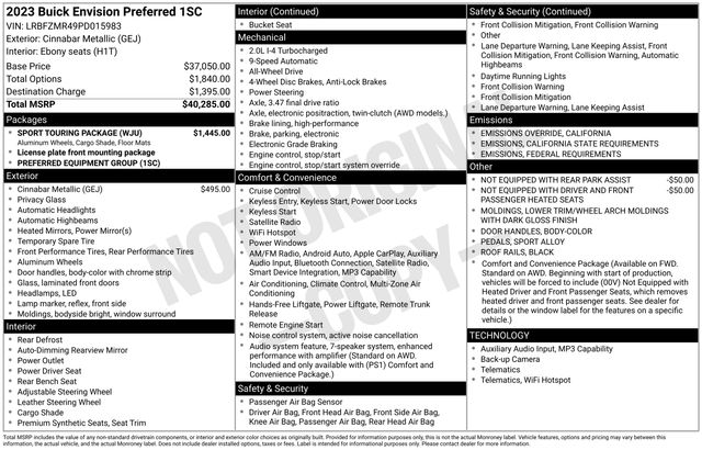 Black Roof Rails, Body-Color Door Handles, Carpeted Front & Rear Floor Mats, Lower Trim/Wheel Arch Moldings, Rear Cargo Compartment Cover, Sport Alloy Pedals, Sport Touring Package, Wheels: 20" Aluminum w/Dark Finish, 3.47 Final Drive Axle Ratio, 4-Wheel Disc Brakes, 6-Speaker Audio System Feature, 7 Speakers, 7-Speaker Audio System Feature w/Amplifier, 8-Way Power Driver Seat Adjuster, ABS brakes, Air Conditioning, Alloy wheels, AM/FM radio: SiriusXM, Apple CarPlay/Android Auto, Auto High-beam Headlights, Auto-dimming door mirrors, Auto-dimming Rear-View mirror, Automatic Emergency Braking, Automatic temperature control, Brake assist, Bumpers: body-color, Cloth w/Leatherette Seat Trim, Compass, Delay-off headlights, Driver door bin, Driver vanity mirror, Dual front impact airbags, Dual front side impact airbags, Electronic Stability Control, Emergency communication system: OnStar and Buick connected services capable, Following Distance Indicator, Forward Collision Alert, Four wheel independent suspension, Front anti-roll bar, Front Bin Center Console USB Ports, Front Bucket Seats, Front Center Armrest, Front dual zone A/C, Front Passenger 6-Way Manual Seat Adjuster, Front Pedestrian Braking, Front reading lights, Fully automatic headlights, Heated door mirrors, Heated front seats, Heated steering wheel, Illuminated entry, IntelliBeam Headlamp Control w/Auto High Beam, Knee airbag, Lane Keep Assist w/Lane Departure Warning, Low tire pressure warning, Not Equipped w/Driver & Fr Passenger Heated Seats, Not Equipped w/Rear Park Assist, Occupant sensing airbag, Outside temperature display, Overhead airbag, Overhead console, Panic alarm, Passenger door bin, Passenger vanity mirror, Power door mirrors, Power driver seat, Power Liftgate, Power steering, Power windows, Preferred Equipment Group 1SC, Premium audio system: Buick Infotainment System, Radio data system, Radio: Buick Infotainment System AM/FM Stereo, Rear anti-roll bar, Rear reading lights, Rear seat center armrest, Rear window defroster, Rear window wiper, Remote keyless entry, Security system, SiriusXM Radio, Speed control, Split folding rear seat, Spoiler, Steering wheel mounted audio controls, Telescoping steering wheel, Tilt steering wheel, Traction control, Trip computer, USB Charging-Only Ports, Variably intermittent wipers, Wheels: 18" Aluminum w/Light Charcoal Met Finish, Wireless Apple CarPlay/Wireless Android Auto, Black Roof Rails, Body-Color Door Handles, Carpeted Front & Rear Floor Mats, Lower Trim/Wheel Arch Moldings, Rear Cargo Compartment Cover, Sport Alloy Pedals, Sport Touring Package, Wheels: 20" Aluminum w/Dark Finish.