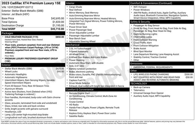 Cold Weather Package, Heated Driver & Front Passenger Seats, Heated Rear Outboard Seating Positions, Heated Steering Wheel, 2-Way Driver Seat Power Lumbar Control, 2-Way Passenger Seat Power Lumbar Control, 3.47 Axle Ratio, 4-Wheel Disc Brakes, 4.2" Diagonal Color Display Driver Info Center, 6-Way Power Passenger Seat Adjuster, 7 Speakers, 7-Speaker Audio System w/Auxiliary Amplifier, 8-Way Power Driver Seat Adjuster, ABS brakes, Air Conditioning, Alloy wheels, AM/FM radio: SiriusXM with 360L, Apple CarPlay/Android Auto, Auto High-beam Headlights, Auto-dimming door mirrors, Auto-Dimming Inside Rear-View Mirror, Auto-dimming Rear-View mirror, Automatic Emergency Braking, Automatic temperature control, Brake assist, Bumpers: body-color, Compass, Delay-off headlights, Driver door bin, Driver vanity mirror, Dual front impact airbags, Dual front side impact airbags, Electronic Cruise Control w/Set & Resume Speed, Electronic Stability Control, Emergency communication system: OnStar and Cadillac connected services capable, Four wheel independent suspension, Front & Rear Park Assist, Front anti-roll bar, Front Bucket Seats, Front Center Armrest, Front dual zone A/C, Front reading lights, Fully automatic headlights, Garage door transmitter, HD Radio, HD Rear Vision Camera, Heated door mirrors, Illuminated entry, Knee airbag, Leather Seating Surfaces, Leather steering wheel, Low tire pressure warning, Manual Rake & Telescoping Steering Column, Memory seat, Not Equipped w/Fr & Rr Pk Assist/Rev Auto Braking, Occupant sensing airbag, Outside temperature display, Overhead airbag, Overhead console, Panic alarm, Passenger door bin, Passenger vanity mirror, Power door mirrors, Power driver seat, Power Liftgate, Power passenger seat, Power steering, Power windows, Preferred Equipment Group 1SE, Radio data system, Radio: Cadillac User Experience AM/FM Stereo, Rain sensing wipers, Rear anti-roll bar, Rear reading lights, Rear seat center armrest, Rear window defroster, Rear window wiper, Remote keyless entry, Roof rack: rails only, Security system, SiriusXM w/360L, Speed control, Speed-sensing steering, Split folding rear seat, Spoiler, Standard Suspension, Steering wheel mounted audio controls, Tachometer, Telescoping steering wheel, Tilt steering wheel, Traction control, Trip computer, Turn signal indicator mirrors, Variably intermittent wipers, Voltmeter, Wheel Locks, Wheels: 18" 10-Spoke Pearl Nickel Finish Alloy, Wireless Apple CarPlay/Wireless Android Auto, Wireless Phone Charging (LPO), Cold Weather Package, Heated Driver & Front Passenger Seats, Heated Rear Outboard Seating Positions, Heated Steering Wheel.