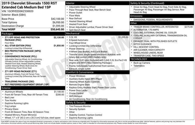 All-Star Edition, Convenience Package, Dual Exhaust w/Polished Outlets, Heavy-Duty Rear Locking Differential, High Capacity Air Filter, Hill Descent Control, Off-Road Suspension, Trailering Package, Z71 Off-Road Package, 10-Way Power Driver Seat w/Lumbar, 12-Volt Rear Auxiliary Power Outlet, 170 Amp Alternator, 2 USB Ports (First Row), 220 Amps Alternator, 3.23 Rear Axle Ratio, 4-Way Manual Driver Seat Adjuster, 4-Wheel Disc Brakes, 4.2" Diagonal Color Display Driver Info Center, 40/20/40 Front Split-Bench Seat, 6 Speakers, 6-Speaker Audio System, ABS brakes, Air Conditioning, All-Weather Floor Liner (LPO) (AAK), Alloy wheels, AM/FM radio, Apple CarPlay/Android Auto, Auxiliary External Transmission Oil Cooler, Bed Protection Package, Bluetooth® For Phone, Body Color Grille, Brake assist, Bumpers: body-color, Chevrolet Connected Access, Chevrolet w/4G LTE, Chevytec Spray-On Black Bedliner, Cloth Seat Trim, Color-Keyed Carpeting Floor Covering, Compass, Deep-Tinted Glass, Delay-off headlights, Driver door bin, Driver vanity mirror, Dual front impact airbags, Dual front side impact airbags, Dual-Zone Automatic Climate Control, Electric Rear-Window Defogger, Electrical Lock Control Steering Column, Electronic Cruise Control, Electronic Stability Control, External Engine Oil Cooler, Front anti-roll bar, Front Center Armrest w/Storage, Front fog lights, Front Frame-Mounted Black Recovery Hooks, Front LED Fog Lamps, Front reading lights, Front Rubberized Vinyl Floor Mats, Front wheel independent suspension, Fully automatic headlights, Heated door mirrors, Heated Driver & Front Passenger Seats, Heated Steering Wheel, Heavy Duty Suspension, High Gloss Black Mirror Caps, Hitch Guidance, Illuminated entry, Integrated Trailer Brake Controller, Keyless Open & Start, Leather Wrapped Steering Wheel, LED Cargo Area Lighting, Low tire pressure warning, Manual Tilt Wheel Steering Column, Manual Tilt/Telescoping Steering Column, Occupant sensing airbag, OnStar & Chevrolet Connected Services Capable, Outside temperature display, Overhead airbag, Overhead console, Panic alarm, Passenger door bin, Passenger vanity mirror, Power Door Locks, Power door mirrors, Power Front Windows w/Driver Express Up/Down, Power Front Windows w/Passenger Express Down, Power Rear Windows w/Express Down, Power steering, Power windows, Preferred Equipment Group 1SP, Premium audio system: Chevrolet Infotainment System 3, Radio data system, Radio: Chevrolet Infotainment 3 System, Rear 60/40 Folding Bench Seat (Folds Up), Rear Dual USB Charging-Only Ports, Rear reading lights, Rear Rubberized-Vinyl Floor Mats, Rear step bumper, Rear Vision Camera, Rear Wheelhouse Liners, Rear window defroster, Remote keyless entry, Remote Vehicle Starter System, Security system, Single-Zone Manual/Semi-Automatic Air Conditioning, Speed control, Speed-sensing steering, Split folding rear seat, Steering Wheel Audio Controls, Steering wheel mounted audio controls, Tachometer, Theft Deterrent System (Unauthorized Entry), Tilt steering wheel, Traction control, Trip computer, Urethane Steering Wheel, Variably intermittent wipers, Voltmeter, Wheels: 18" x 8.5" Bright Silver Painted Aluminum, Wheels: 20" x 9" Painted Aluminum, Z71 Off-Road & Protection Package, All-Star Edition, Convenience Package, Dual Exhaust w/Polished Outlets, Heavy-Duty Rear Locking Differential, High Capacity Air Filter, Hill Descent Control, Off-Road Suspension, Trailering Package, Z71 Off-Road Package.