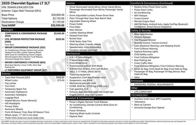 3-Spoke Leather-Wrapped Steering Wheel, Confidence & Convenience Package, Driver Confidence II Package, Driver Convenience Package, Dual Zone Automatic Climate Control, Front Fog Lamps, Heated Driver & Front Passenger Seats, Lane Change Alert w/Side Blind Zone Alert, Rear Cross Traffic Alert, Rear Park Assist w/Audible Warning, Rear Power Liftgate, Remote Start, Universal Home Remote, 18" Aluminum Wheels, 2 Rear USB Charging-Only Ports, 2 USB Ports & Auxiliary Input Jack, 2-Way Power Driver Lumbar Control Seat Adjuster, 3.17 Final Drive Axle Ratio, 4-Wheel Antilock 4-Wheel Disc Brakes, 4-Wheel Disc Brakes, 6 Speaker Audio System Feature, 6 Speakers, 8-Way Power Driver Seat Adjuster, ABS brakes, Air Conditioning, All-Weather Floor Mats, Alloy wheels, AM/FM radio: SiriusXM, Apple CarPlay/Android Auto, Auto High-beam Headlights, Bluetooth® For Phone, Body-Color Trailer Hitch Close-Out Cover, Brake assist, Bumpers: body-color, Cargo Mat, Compass, Delay-off headlights, Driver door bin, Driver vanity mirror, Dual front impact airbags, Dual front side impact airbags, Dual Stainless-Steel Exhaust w/Bright Tips, Electronic Stability Control, Emergency communication system: OnStar and Chevrolet connected services capable, Factory Installed Trailer Hitch, Four wheel independent suspension, Front anti-roll bar, Front Bucket Seats, Front Center Armrest, Front Passenger 4-Way Manual Seat Adjuster, Front reading lights, Fully automatic headlights, Heated door mirrors, High-Intensity Discharge Headlights, Illuminated entry, Interior Protection Package (LPO), Low tire pressure warning, Occupant sensing airbag, Outside temperature display, Overhead airbag, Overhead console, Panic alarm, Passenger door bin, Passenger vanity mirror, Power door mirrors, Power driver seat, Power steering, Power windows, Preferred Equipment Group 2LT, Premium audio system: Chevrolet Infotainment 3, Premium Cloth Seat Trim, Radio data system, Radio: Chevrolet Infotainment 3 System w/AM/FM, Rear anti-roll bar, Rear reading lights, Rear seat center armrest, Rear window defroster, Rear window wiper, Remote keyless entry, Roof rack: rails only, Security system, Set of 4 Wheel Locks (LPO), SiriusXM Radio, Speed control, Speed-sensing steering, Split folding rear seat, Spoiler, Steering wheel mounted audio controls, Tachometer, Telescoping steering wheel, Tilt steering wheel, Traction control, Trailering Equipment, Trip computer, Variably intermittent wipers, 3-Spoke Leather-Wrapped Steering Wheel, Confidence & Convenience Package, Driver Confidence II Package, Driver Convenience Package, Dual Zone Automatic Climate Control, Front Fog Lamps, Heated Driver & Front Passenger Seats, Lane Change Alert w/Side Blind Zone Alert, Rear Cross Traffic Alert, Rear Park Assist w/Audible Warning, Rear Power Liftgate, Remote Start, Universal Home Remote.
