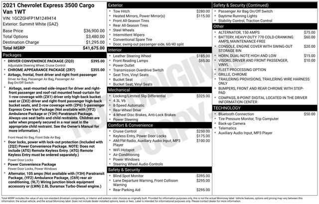 150 Amp Alternator, 16" x 6.5" Steel Wheels, 3.42 Rear Axle Ratio, Bluetooth® For Phone, Chrome Appearance Package, Chrome Grille, Cruise Control, Driver Convenience Package, Front & Rear Chrome Bumpers w/Step-Pad, Heavy-Duty Rear Locking Differential, Heavy-Duty Trailering Equipment, Power windows, Preferred Equipment Group 1WT, Radio: AM/FM Stereo w/MP3 Player/Seek & Scan, Rear Park Assist, Side Blind Zone Alert, Tilt Steering Wheel, USB Port, Vinyl Seat Trim, 2 Speakers, 4-Wheel Disc Brakes, a 770 CCA Heavy-Duty Maintenance-Free Battery for those cold mornings, 8-Point Digital Compass, ABS brakes, Air Conditioning, AM/FM radio, AM/FM Stereo w/MP3 Player, Auxiliary Lighting, Delay-off headlights, Driver & Front Passenger High-Back Bucket Seats, Driver & Front Passenger Vinyl Visors, Driver door bin, Driver's Seat Mounted Armrest, Dual front impact airbags, Dual front side impact airbags, Electronic Stability Control, Emergency communication system: OnStar and Chevrolet connected services capable, Engine Cover Console w/Swing-Out Storage Bin, Forward Collision Alert, Front anti-roll bar, Front Bucket Seats, Front Reclining High-Back Bucket Seats, Front wheel independent suspension, Full-Length Black Rubberized-Vinyl Floor Covering, Fully automatic headlights, High & Low Dual-Note Horn, Lane Departure Warning System, Leather-Wrapped Steering Wheel, Low tire pressure warning, Occupant sensing airbag, Overhead airbag, Passenger cancellable airbag, Passenger door bin, Passenger seat mounted armrest, Power steering, Power-Adjustable Black Outside Heated Mirrors, Reading Lights, Remote Keyless Entry, Seat-Mounted & Roof-Rail Side-Impact Airbags, Single-Zone Manual Air Conditioning, Steering Wheel Mounted Audio Controls, Tachometer, Theft Alarm Notification, Traction control, Trip computer, Underhood Lights, Variably intermittent wipers, Voltmeter, One Owner Clean Carfax, EXTENDED CARGO, 150 Amp Alternator, 16" x 6.5" Steel Wheels, 3.42 Rear Axle Ratio, Bluetooth® For Phone, Chrome Appearance Package, Chrome Grille, Cruise Control, Driver Convenience Package, Front & Rear Chrome Bumpers w/Step-Pad, Heavy-Duty Rear Locking Differential, Heavy-Duty Trailering Equipment, Power windows, Preferred Equipment Group 1WT, Radio: AM/FM Stereo w/MP3 Player/Seek & Scan, Rear Park Assist, Side Blind Zone Alert, Tilt Steering Wheel, USB Port, Vinyl Seat Trim.