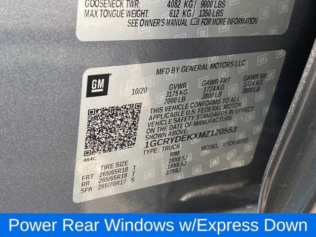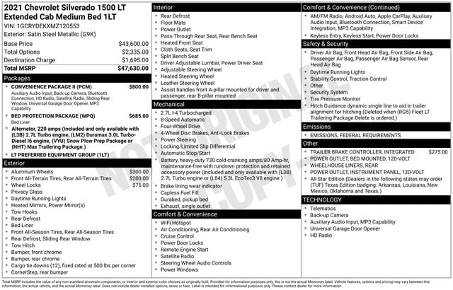 10-Way Power Driver Seat w/Lumbar, 12-Volt Rear Auxiliary Power Outlet, 120-Volt Instrument Panel Power Outlet, 2 USB Ports, 2 USB Ports (First Row), 4.2" Diagonal Color Display Driver Info Center, All-Star Edition, Auto-Locking Rear Differential, Bed Protection Package, Bluetooth® For Phone, Chevytec Spray-On Black Bedliner, Chrome Grille, Chrome Mirror Caps, Color-Keyed Carpeting Floor Covering, Compass, Convenience Package, Convenience Package II, Deep-Tinted Glass, Dual-Zone Automatic Climate Control, Electric Rear-Window Defogger, Electrical Lock Control Steering Column, Electronic Cruise Control, EZ Lift Power Lock & Release Tailgate, Front Frame-Mounted Black Recovery Hooks, Front Rubberized Vinyl Floor Mats, HD Radio, HD Rear Vision Camera, Heated Driver & Front Outboard Passenger Seats, Heated Steering Wheel, Keyless Open & Start, Leather Wrapped Steering Wheel, LED Cargo Area Lighting, Manual Tilt/Telescoping Steering Column, OnStar & Chevrolet Connected Services Capable, Power Door Locks, Power Front Windows w/Driver Express Up/Down, Power Front Windows w/Passenger Express Down, Power Rear Windows w/Express Down, Power Sliding Rear Window w/Rear Defogger, Preferred Equipment Group 1LT, Radio: Chevrolet Infotainment 3 Plus System, Rear 60/40 Folding Bench Seat (Folds Up), Rear Dual USB Charging-Only Ports, Rear Rubberized-Vinyl Floor Mats, Rear Vision Camera, Rear Wheelhouse Liners, Remote Vehicle Starter System, SiriusXM Radio, SiriusXM w/360L, Standard Tailgate, Steering Wheel Audio Controls, Trailering Package, Universal Home Remote, Wireless Phone Projection, 3.42 Rear Axle Ratio, 4-Wheel Disc Brakes, 40/20/40 Front Split-Bench Seat, 4G LTE Wi-Fi Hot Spot Capable, 6 Speakers, ABS brakes, Air Conditioning, Alloy wheels, AM/FM radio: SiriusXM, Apple CarPlay/Android Auto, Automatic temperature control, Brake assist, Bumpers: chrome, Chevrolet Connected Access Capable, Cloth Seat Trim, Delay-off headlights, Driver door bin, Driver vanity mirror, Dual front impact airbags, Dual front side impact airbags, Electronic Stability Control, Front anti-roll bar, Front Center Armrest w/Storage, Front dual zone A/C, Front reading lights, Front wheel independent suspension, Fully automatic headlights, Heated door mirrors, Heated front seats, Heated steering wheel, Heavy Duty Suspension, Hitch Guidance, Illuminated entry, Low tire pressure warning, Occupant sensing airbag, Outside temperature display, Overhead airbag, Overhead console, Panic alarm, Passenger door bin, Passenger vanity mirror, Power door mirrors, Power driver seat, Power steering, Power windows, Premium audio system: Chevrolet Infotainment 3, Radio data system, Radio: Chevrolet Infotainment 3 System, Rear reading lights, Rear step bumper, Rear window defroster, Remote keyless entry, Security system, Speed control, Speed-sensing steering, Split folding rear seat, Steering wheel mounted audio controls, Tachometer, Telescoping steering wheel, Theft Deterrent System (Unauthorized Entry), Tilt steering wheel, Traction control, Trip computer, Variably intermittent wipers, Voltmeter, Wheels: 18" x 8.5" Bright Silver Painted Aluminum, 10-Way Power Driver Seat w/Lumbar, 12-Volt Rear Auxiliary Power Outlet, 120-V