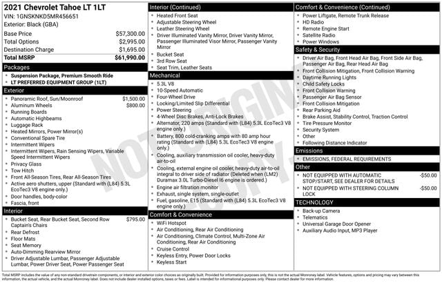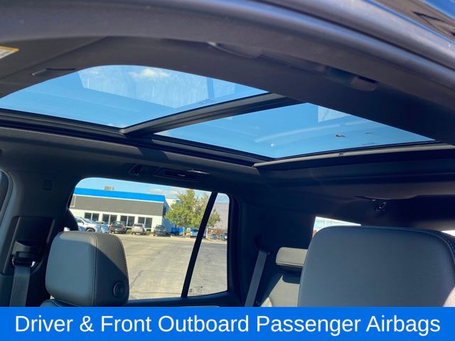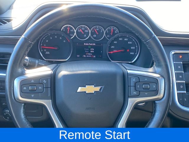 1st & 2nd Row Color-Keyed Carpeted Floor Mats, 2 USB Data Ports, Apple CarPlay/Android Auto, Auto-Dimming Inside Rear-View Mirror, Bright Front & Rear Door Sill Plates, Color-Keyed Carpeting Floor Covering, Driver & Front Outboard Passenger Airbags, Dual-Pane Power Panoramic Sunroof, Floor Console w/Storage Area, Hands-Free Rear Power Programmable Liftgate, HD Radio, Infotainment Display, Leather-Wrapped Steering Wheel, LED Daytime Running Lamps, Memory Settings for Driver, Power Liftgate, Preferred Equipment Group 1LT, Remote Start, SiriusXM Radio w/360L, Speed control, Universal Home Remote, Wheels: 20" x 9" Painted Aluminum, 10-Way Power Driver & Passenger Seat Adjusters, 2nd Row Manual Bucket Seats, 3.23 Rear Axle Ratio, 3rd row seats: split-bench, 4-Wheel Disc Brakes, 9 Speakers, ABS brakes, Air Conditioning, Alloy wheels, AM/FM radio: SiriusXM with 360L, Auto High-beam Headlights, Auto-dimming Rear-View mirror, Automatic temperature control, Bose 9-Speaker Stereo Audio System Feature, Brake assist, Bumpers: body-color, Compass, Delay-off headlights, Driver door bin, Driver vanity mirror, Dual front impact airbags, Dual front side impact airbags, Electronic Stability Control, Emergency communication system: OnStar and Chevrolet connected services capable, Four wheel independent suspension, Front anti-roll bar, Front Bucket Seats, Front Center Armrest, Front dual zone A/C, Front High-Back Reclining Bucket Seats, Front reading lights, Fully automatic headlights, Garage door transmitter, Heated door mirrors, Heated Driver & Front Passenger Seats, Heated front seats, Illuminated entry, Leather Seat Trim, Leather steering wheel, Low tire pressure warning, Memory seat, Not Equipped w/Automatic Stop/Start, Not Equipped w/Steering Column Lock, Occupant sensing airbag, Outside temperature display, Overhead airbag, Overhead console, Panic alarm, Passenger door bin, Passenger vanity mirror, Power door mirrors, Power driver seat, Power passenger seat, Power steering, Power windows, Premium audio system: Chevrolet Infotainment 3, Premium Smooth Ride Suspension, Radio: Chevrolet Infotainment 3 Plus System, Rain sensing wipers, Rear air conditioning, Rear anti-roll bar, Rear reading lights, Rear seat center armrest, Rear window defroster, Rear window wiper, Remote keyless entry, Roof rack: rails only, Security system, Speed-sensing steering, Split folding rear seat, Spoiler, Steering wheel mounted audio controls, Tachometer, Telescoping steering wheel, Tilt steering wheel, Traction control, Trip computer, Variably intermittent wipers, Voltmeter, Wheels: 18" x 8.5" Bright Silver Painted Aluminum, One Owner Clean Carfax, 5.3L V-8 ENGINE, 1st & 2nd Row Color-Keyed Carpeted Floor Mats, 2 USB Data Ports, Apple CarPlay/Android Auto, Auto-Dimming Inside Rear-View Mirror, Bright Front & Rear Door Sill Plates, Color-Keyed Carpeting Floor Covering, Driver & Front Outboard Passenger Airbags, Dual-Pane Power Panoramic Sunroof, Floor Console w/Storage Area, Hands-Free Rear Power Programmable Liftgate, HD Radio, Infotainment Display, Leather-Wrapped Steering Wheel, LED Daytime Running Lamps, Memory Settings for Driver, Power Liftgate, Preferred Equipment Group 1LT, Remote Start, SiriusXM Ra