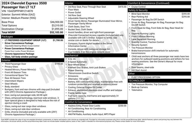 15-Passenger Seating (2-3-3-3-4 Seating Config), Chrome Appearance Package, Chrome Grille, Deluxe Console w/Swing Out Storage Bin, Forward Collision Alert, Front & Rear Chrome Bumpers w/Step-Pad, Full-Floor Color-Keyed Carpeting, Lane Departure Warning System, Preferred Equipment Group 1LT, Rear Park Assist, Remote Keyless Entry, Speed control, Theft Alarm Notification, Wheel Trim w/Chrome Center Caps, 12-Passenger Seating (2-3-3-4 Seating Config), 16" x 6.5" Steel Wheels, 2 Speakers, 3.42 Rear Axle Ratio, 3rd row seats: bench, 4-Wheel Disc Brakes, 4th-Row Bench Seat, ABS brakes, Air Conditioning, AM/FM radio, AM/FM Stereo w/MP3 Player, Bumpers: chrome, Compass, Custom Cloth Seat Trim, Delay-off headlights, Driver door bin, Driver vanity mirror, Driver's Seat Mounted Armrest, Dual front impact airbags, Dual front side impact airbags, Electronic Stability Control, Emergency communication system: OnStar and Chevrolet connected services capable, Front anti-roll bar, Front Bucket Seats, Front reading lights, Front wheel independent suspension, Fully automatic headlights, Heated door mirrors, Illuminated entry, Keyless Entry Control Module (LPO), Low tire pressure warning, Occupant sensing airbag, Overhead airbag, Panic alarm, Passenger cancellable airbag, Passenger door bin, Passenger seat mounted armrest, Passenger vanity mirror, Power door mirrors, Power steering, Power windows, Rear air conditioning, Rear reading lights, Reclining Front Bucket Seats w/Inboard Armrests, Remote keyless entry, Security system, Side Blind Zone Alert, Sliding Passenger-Side Door, Tachometer, Tilt steering wheel, Traction control, Trip computer, Variably intermittent wipers, Voltmeter, One Owner Clean Carfax, 15 PASSENGER, 15-Passenger Seating (2-3-3-3-4 Seating Config), Chrome Appearance Package, Chrome Grille, Deluxe Console w/Swing Out Storage Bin, Forward Collision Alert, Front & Rear Chrome Bumpers w/Step-Pad, Full-Floor Color-Keyed Carpeting, Lane Departure Warning System, Preferred Equipment Group 1LT, Rear Park Assist, Remote Keyless Entry, Speed control, Theft Alarm Notification, Wheel Trim w/Chrome Center Caps.