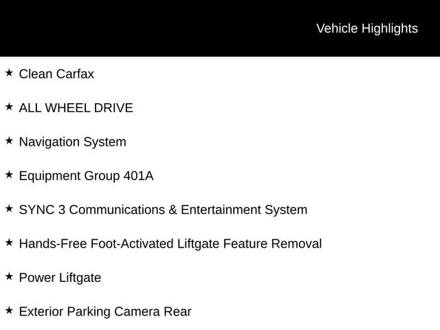 Equipment Group 401A, Exterior Parking Camera Rear, Front fog lights, Hands-Free Foot-Activated Liftgate Feature Removal, Navigation System, Power Liftgate, Speed control, SYNC 3 Communications & Entertainment System, 3.47 Axle Ratio, 4-Wheel Disc Brakes, 6 Speakers, ABS brakes, Air Conditioning, Alloy wheels, AM/FM radio: SiriusXM, AM/FM Stereo, Auto High-beam Headlights, Auto-dimming Rear-View mirror, Automatic temperature control, Brake assist, Bumpers: body-color, Compass, Delay-off headlights, Driver door bin, Driver vanity mirror, Dual front impact airbags, Dual front side impact airbags, Electronic Stability Control, Emergency communication system: SYNC 3 911 Assist, FordPass Connect, Four wheel independent suspension, Front anti-roll bar, Front Bucket Seats, Front Center Armrest, Front dual zone A/C, Front reading lights, Fully automatic headlights, Garage door transmitter, Heated ActiveX Trimmed Front Sport Contour Bucket Seats, Heated door mirrors, Heated front seats, Heated steering wheel, Illuminated entry, Knee airbag, Low tire pressure warning, Memory seat, Occupant sensing airbag, Outside temperature display, Overhead airbag, Overhead console, Panic alarm, Passenger door bin, Passenger vanity mirror, Power door mirrors, Power driver seat, Power passenger seat, Power steering, Power windows, Radio data system, Rain sensing wipers, Rear anti-roll bar, Rear reading lights, Rear seat center armrest, Rear window defroster, Rear window wiper, Remote keyless entry, Roof rack: rails only, Security system, Speed-sensing steering, Speed-Sensitive Wipers, Split folding rear seat, Spoiler, Steering wheel mounted audio controls, Tachometer, Telescoping steering wheel, Tilt steering wheel, Traction control, Trip computer, Variably intermittent wipers, Voice-Activated Touchscreen Navigation System, Wheels: 19" Machined-Face Aluminum, Clean Carfax, ALL WHEEL DRIVE, Equipment Group 401A, Exterior Parking Camera Rear, Front fog lights, Hands-Free Foot-Activated Liftgate Feature Removal, Navigation System, Power Liftgate, Speed control, SYNC 3 Communications & Entertainment System.
