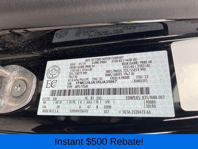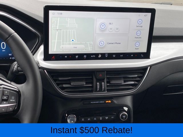 2.91 Axle Ratio, 4-Wheel Disc Brakes, 6 Speakers, ABS brakes, Air Conditioning, Alloy wheels, AM/FM radio: SiriusXM, AM/FM Stereo, Auto High-beam Headlights, Auto-dimming Rear-View mirror, Automatic temperature control, Brake assist, Bumpers: body-color, Compass, Delay-off headlights, Driver door bin, Driver vanity mirror, Dual front impact airbags, Dual front side impact airbags, Electronic Fuel Door Release, Electronic Stability Control, Emergency communication system: SYNC 4 911 Assist, Exterior Parking Camera Rear, FordPass Connect, Four wheel independent suspension, Front anti-roll bar, Front Bucket Seats, Front Center Armrest, Front dual zone A/C, Front fog lights, Front reading lights, Fully automatic headlights, Garage door transmitter, Heated ActiveX Trimmed Front Sport Contour Bucket Seats, Heated door mirrors, Heated front seats, Heated steering wheel, Illuminated entry, Knee airbag, Low tire pressure warning, Memory seat, Navigation system: Connected Navigation, Neutral Towing Capability, Occupant sensing airbag, Outside temperature display, Overhead airbag, Overhead console, Panic alarm, Passenger door bin, Passenger vanity mirror, Pedestrian Alert Sounder, Power door mirrors, Power driver seat, Power Liftgate, Power passenger seat, Power steering, Power windows, Radio data system, Rain sensing wipers, Rear anti-roll bar, Rear reading lights, Rear seat center armrest, Rear window defroster, Rear window wiper, Remote keyless entry, Roof rack: rails only, Security system, Speed control, Speed-sensing steering, Speed-Sensitive Wipers, Split folding rear seat, Spoiler, Steering wheel mounted audio controls, SYNC 4 w/Enhanced Voice Recognition, Tachometer, Telescoping steering wheel, Tilt steering wheel, Traction control, Trip computer, Variably intermittent wipers, Wheels: 19" Machined-Face Aluminum.