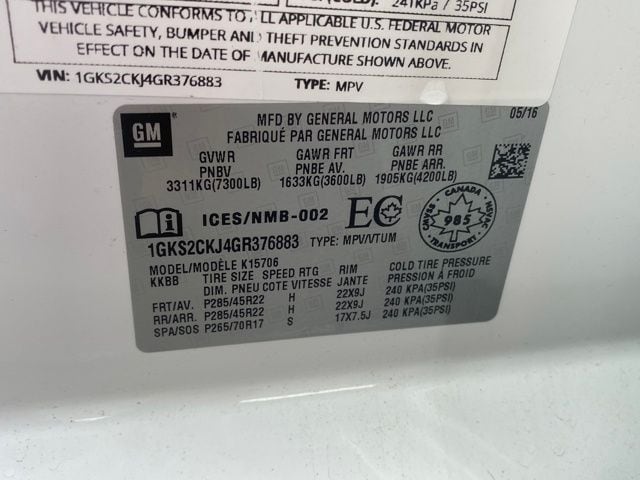 Bose Centerpoint Premium 10-Speaker Surround Sound, Enhanced Driver Alert Package, Exterior Parking Camera Rear, Forward Collision Alert Sensor Indicator, Intellibeam Automatic High Beam On/Off Headlamps, Lane Keep Assist, Magnetic Ride Control Suspension Package, Navigation System, Power Liftgate, Safety Alert Driver Seat, Speed control, 10 Speakers, 17" Disc/Disc VAC Power Brakes, 3.23 Axle Ratio, 3rd row seats: split-bench, 4-Wheel Disc Brakes, 5 Auxiliary 12-volt Power Outlets, ABS brakes, Adaptive suspension, Adjustable pedals, Air Conditioning, Alloy wheels, AM/FM radio: SiriusXM, AppLink/Apple CarPlay and Android Auto, Auto High-beam Headlights, Auto-dimming door mirrors, Auto-dimming Rear-View mirror, Automatic temperature control, Black Assist Steps w/Chrome Strip, Bodyside moldings, Brake assist, Bumpers: body-color, CD Player, CD player, Compass, Delay-off headlights, Driver door bin, Driver vanity mirror, Dual front impact airbags, Dual front side impact airbags, Electronic Stability Control, Emergency communication system: OnStar Guidance, Front anti-roll bar, Front Bucket Seats, Front Center Armrest, Front dual zone A/C, Front fog lights, Front reading lights, Front wheel independent suspension, Full-Feature Reclining Bucket Seats, Fully automatic headlights, Garage door transmitter, Genuine wood console insert, Genuine wood dashboard insert, Genuine wood door panel insert, Hands Free Power Liftgate, Heated & Cooled Driver & Front Passenger Seats, Heated door mirrors, Heated front seats, Heated Leather-Wrapped Steering Wheel, Heated rear seats, Heated steering wheel, High-Intensity Discharge Headlights, Illuminated entry, Inside Rear-View Auto-Dimming Mirror, Integrated Trailer Brake Controller, Leather Shift Knob, Low tire pressure warning, Memory Package, Memory seat, Occupant sensing airbag, OnStar Basic Plan For 5 Years, OnStar w/4G LTE, Outside temperature display, Overhead airbag, Overhead console, Panic alarm, Passenger door bin, Passenger vanity mirror, Passive Entry System, Pedal memory, Perforated Leather-Appointed Seat Trim, Power door mirrors, Power driver seat, Power passenger seat, Power Release Second Row Bucket Seats, Power steering, Power Tilt & Telescopic Steering Column, Power windows, Power-Adjustable Pedals For Accelerator & Brake, Premium audio system: IntelliLink, Push Button Keyless Start, Radio: AM/FM w/Navigation, Rain sensing wipers, Rear air conditioning, Rear anti-roll bar, Rear Cross-Traffic Alert, Rear reading lights, Rear window defroster, Rear window wiper, Remote keyless entry, Roof rack: rails only, Security system, Side Blind Zone Alert w/Lane Change Alert, SiriusXM Satellite Radio, Speed-sensing steering, Split folding rear seat, Spoiler, Steering wheel memory, Steering wheel mounted audio controls, Tachometer, Telescoping steering wheel, Tilt steering wheel, Traction control, Trip computer, Turn signal indicator mirrors, Unauthorized Entry Electrical Theft Deterrent Sys., Universal Home Remote, Variably intermittent wipers, Ventilated front seats, Voltmeter, Wheels: 20" x 9" Ultra Bright Machined Aluminum, Wheels: 22" x 8.5" Aluminum w/Chrome Inserts, Wireless Charging, Bose Centerpoint Premium 10-Speaker Surround Sound, Enhanced Driver Alert Package, Exte