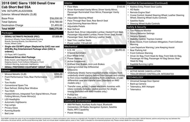 Chrome Recovery Hooks, Denali Ultimate Package, Enhanced Driver Alert Package, Forward Collision Alert, Integrated Trailer Brake Controller, IntelliBeam Automatic High Beam On/Off Headlight, Lane Keep Assist, Low Speed Forward Automatic Braking, Navigation System, Power Sunroof, Tri-Mode Power Steps, Wheel Locks (Set of 4) (LPO), Wheels: 22" Aluminum w/Premium Paint, 110-Volt AC Power Outlet, 150 Amp Alternator, 1st & 2nd Row Color-Keyed Carpeted Floor Mats, 2-Speed Active Electronic AutoTrac Transfer Case, 4-Wheel Disc Brakes, 6" Rectangular Chromed Tubular Assist Steps, 7 Speakers, 8" Multi-Color Customizable Driver Display, ABS brakes, Active Noise Cancellation, Adaptive suspension, Adjustable pedals, Air Conditioning, Alloy wheels, AM/FM radio: SiriusXM, Auto High-beam Headlights, Auto-dimming door mirrors, Auto-Dimming Inside Rear-View Mirror, Auto-dimming Rear-View mirror, Automatic temperature control, Body Color Lower Front Bumper, Body Color Rear Bumper w/Cornersteps, Bodyside moldings, Bose Speaker System, Brake assist, Bumpers: body-color, CD player, Chrome Bodyside Moldings, Chrome Door Handles, Chrome Mirror Caps, Color-Keyed Carpeting, Compass, Deep-Tinted Glass, Delay-off headlights, Driver & Front Passenger Illuminated Vanity Mirrors, Driver door bin, Driver vanity mirror, Dual front impact airbags, Dual front side impact airbags, Dual-Zone Automatic Climate Control, Electric Rear-Window Defogger, Electronic Stability Control, Exterior Parking Camera Rear, EZ Lift & Lower Tailgate, Floor Mounted Console, Front & Rear All-Weather Floor Mats, Front anti-roll bar, Front Center Armrest w/Storage, Front dual zone A/C, Front fog lights, Front Frame-Mounted Black Recovery Hooks, Front Full Feature Power Reclining Bucket Seats, Front reading lights, Front wheel independent suspension, Fully automatic headlights, Garage door transmitter, GMC 4G LTE, GMC Connected Access, HD Radio, Heated & Ventilated Front Bucket Seats, Heated door mirrors, Heated front seats, Heated steering wheel, Illuminated entry, Leather Wrapped Heated Steering Wheel, Low tire pressure warning, MagneRide Magnetic Ride Control Suspension, Manual Tilt/Telescoping Steering Column, Memory seat, Occupant sensing airbag, OnStar & GMC Connected Services Capable, Outside temperature display, Overhead airbag, Overhead console, Panic alarm, Passenger door bin, Passenger vanity mirror, Perforated Leather Appointed Seat Trim, Polished Exhaust Tip, Power Adjustable Pedals, Power door mirrors, Power driver seat, Power Folding & Adjustable Heated Outside Mirrors, Power passenger seat, Power Sliding Rear Window w/Defogger, Power steering, Power windows, Power Windows w/Driver Express Up & Down, Preferred Equipment Group 5SA, Premium audio system: GMC Infotainment System, Radio data system, Radio: AM/FM/GMC Infotainment & Navigation, Rear 60/40 Folding Bench Seat (Folds Up), Rear reading lights, Rear seat center armrest, Rear step bumper, Rear Wheelhouse Liners, Rear window defroster, Remote Keyless Entry, Remote keyless entry, Remote Locking Tailgate, Remote Vehicle Starter System, Security system, Single Slot CD/MP3 Player, SiriusXM Satellite Radio, Speed control, Speed-sensing steering, Split folding rear seat, Steering Wheel Audio Controls, Steering wheel mounted audio controls, Tachometer, Telescoping steering wheel, Theft Deterrent System (Unauthorized Entry), Thin Profile LED Fog Lamps, Tilt steering wheel, Traction control, Trailering Equipment, Trip computer, Turn signal indicator mirrors, Ultrasonic Front & Rear Park Assist, Universal Home Remote, Variably intermittent wipers, Ventilated front seats, Voltmeter, Wheels: 20" x 9" Bright Machined Aluminum, Wireless Charging, Chrome Recovery Hooks, Denali Ultimate Package, Enhanced Driver Alert Package, Forward Collision Alert, Integrated Trailer Br