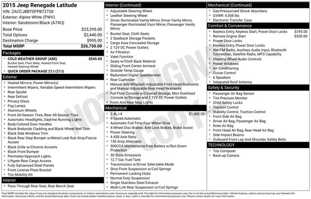 16" x 6.5" Aluminum Wheels, 17" x 7.0" Aluminum Wheels, 4-Wheel Disc Brakes, 6 Speakers, ABS brakes, Air Conditioning, Alloy wheels, AM/FM radio: SiriusXM, Anti-whiplash front head restraints, Brake assist, Cloth Low-Back Bucket Seats, Cold Weather Group (DISC), Compass, Delay-off headlights, Driver door bin, Driver vanity mirror, Dual front impact airbags, Dual front side impact airbags, Electronic Stability Control, Four wheel independent suspension, Front & Rear Floor Mats, Front anti-roll bar, Front Bucket Seats, Front Center Armrest, Front fog lights, Front reading lights, Fully automatic headlights, Heated door mirrors, Heated Front Seats, Heated Steering Wheel, Illuminated entry, Knee airbag, Leather steering wheel, Low tire pressure warning, Normal Duty Suspension, Occupant sensing airbag, Outside temperature display, Overhead airbag, Overhead console, Panic alarm, ParkView Rear Back-Up Camera, Passenger door bin, Passenger vanity mirror, Passive Entry/Keyless Go, Power door mirrors, Power steering, Power windows, Quick Order Package 27J, Radio data system, Radio: Uconnect 5.0 AM/FM/BT, Rear anti-roll bar, Rear reading lights, Rear window defroster, Rear window wiper, Remote keyless entry, Remote Start System, Roof rack: rails only, Speed control, Split folding rear seat, Spoiler, Steering wheel mounted audio controls, Tachometer, Telescoping steering wheel, Tilt steering wheel, Traction control, Trip computer, Variably intermittent wipers, Voltmeter, Windshield Wiper De-Icer.