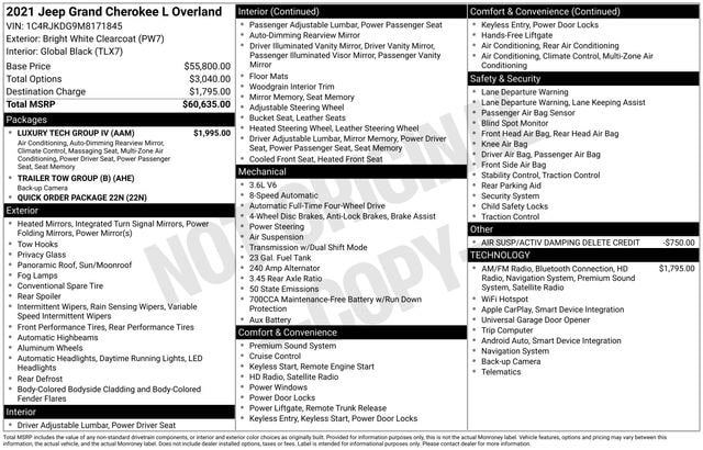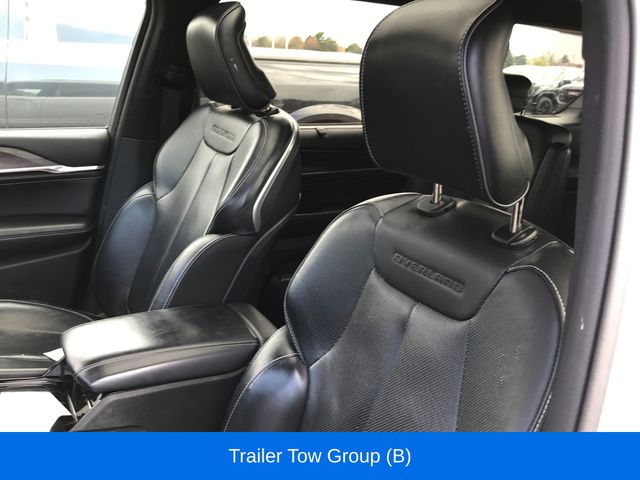 2nd Row Manual Window Shades, ATC w/4 Zone Temp Control, Driver Power Seat Back Massage, Front Passenger Power Seat Back Massage, GPS Navigation, Luxury Tech Group IV, Nappa Leather Seats (TL), Passenger Seat Memory, Power Adjust 12-Way Driver Seat, Power Adjust 12-Way Front Passenger Seat, Rearview Autodim Digital Display Mirror, Trailer Hitch Zoom, Trailer Tow Group (B), Wireless Charging Pad, 10 Speakers, 10.1" Touchscreen Display, 19 Speakers High Performance Audio, 3.45 Rear Axle Ratio, 3rd row seats: split-bench, 4-Wheel Disc Brakes, 950 Watt Amplifier, ABS brakes, Adaptive suspension, Air Conditioning, Air Susp/Activ Damping Delete Credit, Alloy wheels, AM/FM radio: SiriusXM w/360L, Anti-whiplash front head restraints, Apple CarPlay, Apple CarPlay/Android Auto, Audio memory, Auto High-beam Headlights, Auto-dimming door mirrors, Auto-dimming Rear-View mirror, Auto-leveling suspension, Automatic temperature control, Aux Battery, Brake assist, Bumpers: body-color, Compass, Connected Travel & Traffic Services, Connectivity - US/Canada, Delay-off headlights, Disassociated Touchscreen Display, Driver door bin, Driver vanity mirror, Dual front impact airbags, Dual front side impact airbags, Electronic Stability Control, Emergency communication system, Four wheel independent suspension, Front anti-roll bar, Front Bucket Seats, Front Center Armrest w/Storage, Front dual zone A/C, Front fog lights, Front reading lights, Fully automatic headlights, Garage door transmitter, Google Android Auto, GPS Antenna Input, HD Radio, Heated door mirrors, Heated front seats, Heated rear seats, Heated steering wheel, Illuminated entry, Integrated Center Stack Radio, Integrated Voice Command w/Bluetooth, Knee airbag, Leather steering wheel, Low tire pressure warning, Memory seat, Nappa Leather Seats, Navigation System, Normal Duty Suspension, Occupant sensing airbag, Outside temperature display, Overhead airbag, Overhead console, Panic alarm, ParkView Rear Back-Up Camera, Passenger door bin, Passenger vanity mirror, Power door mirrors, Power driver seat, Power Fold Seatbacks, Power Liftgate, Power moonroof: CommandView, Power passenger seat, Power steering, Power windows, Quick Order Package 22N, Radio data system, Radio: Uconnect 5 Nav w/10.1" Display, Radio: Uconnect 5 Nav w/8.4" Display, Rain sensing wipers, Rear air conditioning, Rear anti-roll bar, Rear reading lights, Rear window defroster, Rear window wiper, Reclining 3rd row seat, Remote keyless entry, Roof rack: rails only, Security system, SiriusXM Satellite Radio, SiriusXM w/360L, Speed control, Speed-Sensitive Wipers, Split folding rear seat, Spoiler, Steering wheel memory, Steering wheel mounted audio controls, Tachometer, Telescoping steering wheel, Tilt steering wheel, Traction control, Trip computer, Turn signal indicator mirrors, USB Host Flip, Variably intermittent wipers, Ventilated front seats, Voltmeter, Wheels: 20" x 8.5" Machined Face Aluminum, 2nd Row Manual Window Shades, ATC w/4 Zone Temp Control, Driver Power Seat Back Massage, Front Passenger Power Seat Back Massage, GPS Navigation, Luxury Tech Group IV, Nappa Leather Seats (TL), Passenger Seat Memory, Power Adjust 12-Way Driver Seat, Power Adjust 12-Way Front Passenger Seat, Rearview Autodim Digital Display Mirror, Trailer Hitch Zoom, Trailer Tow Group (B), Wireless Charging Pad.
