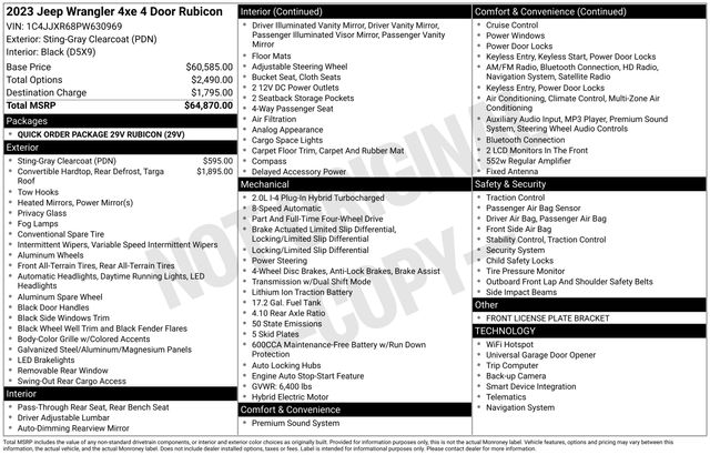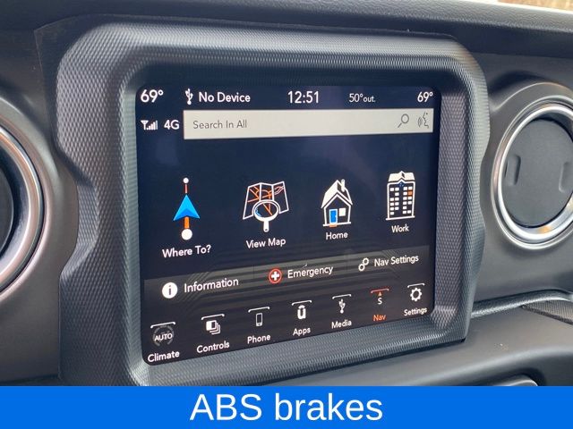 ABS brakes, Alloy wheels, Apple CarPlay/Android Auto, Compass, Electronic Stability Control, Front dual zone A/C, Heated door mirrors, Illuminated entry, Low tire pressure warning, Navigation System, ParkView Rear Back-Up Camera, Passenger door bin, Quick Order Package 29V Rubicon, Radio: Uconnect 4C Nav w/8.4" Display, Remote keyless entry, Speed control, Traction control.
