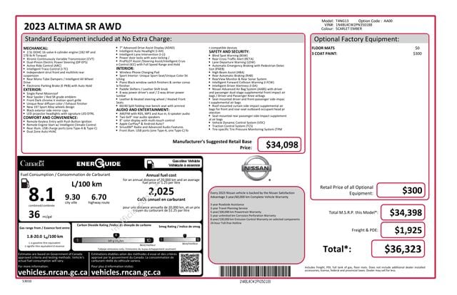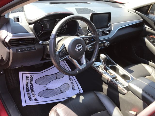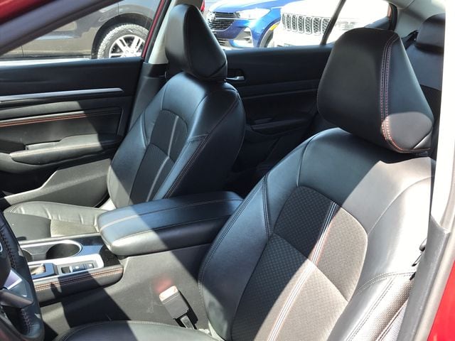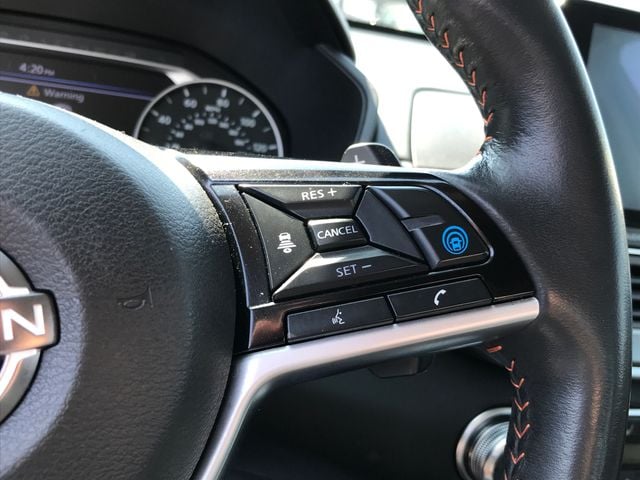 4-Wheel Disc Brakes, 6 Speakers, ABS brakes, Air Conditioning, Alloy wheels, AM/FM radio: SiriusXM, Auto High-beam Headlights, Blind Spot Warning, Brake assist, Bumpers: body-color, Delay-off headlights, Driver door bin, Driver vanity mirror, Dual front impact airbags, Dual front side impact airbags, Electronic Stability Control, Four wheel independent suspension, Front anti-roll bar, Front Bucket Seats, Front Center Armrest, Front reading lights, Front Sport Bucket Seats, Fully automatic headlights, Illuminated entry, Knee airbag, Leather Shift Knob, Low tire pressure warning, NissanConnect featuring Apple CarPlay and Android Auto, Occupant sensing airbag, Outside temperature display, Overhead airbag, Overhead console, Panic alarm, Passenger door bin, Passenger vanity mirror, Power door mirrors, Power driver seat, Power steering, Power windows, Radio data system, Radio: AM/FM Audio System, Rear anti-roll bar, Rear Parking Sensors, Rear reading lights, Rear seat center armrest, Rear side impact airbag, Rear window defroster, Remote keyless entry, Security system, Speed control, Speed-sensing steering, Speed-Sensitive Wipers, Split folding rear seat, Sport Seat Trim, Steering wheel mounted audio controls, Tachometer, Telescoping steering wheel, Tilt steering wheel, Traction control, Trip computer, Variably intermittent wipers, Wheels: 19" Sport Alloy.