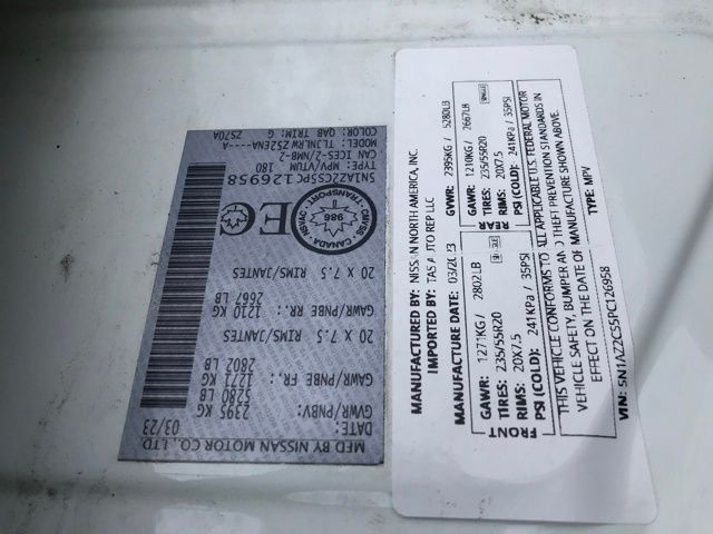 Blind Spot Warning, Dual-Panel Moonroof, Exterior Parking Camera Rear, Heated Front Bucket Seats, Navigation system: NissanConnect Navigation, NissanConnect featuring Apple CarPlay and Android Auto, Power Liftgate, Roof Rail Delete, SL Moonroof Package, Speed control, Wheels: 20" Machined Aluminum-Alloy, 11 Speakers, 4-Wheel Disc Brakes, 4.667 Axle Ratio, ABS brakes, Air Conditioning, Alloy wheels, AM/FM radio: SiriusXM, AM/FM/CD/MP3/WMA Audio System, Auto High-beam Headlights, Auto-dimming Rear-View mirror, Automatic temperature control, Brake assist, Bumpers: body-color, CD player, Child-Seat-Sensing Airbag, Delay-off headlights, Driver door bin, Driver vanity mirror, Dual front impact airbags, Dual front side impact airbags, Electronic Stability Control, Four wheel independent suspension, Front anti-roll bar, Front Bucket Seats, Front Center Armrest, Front dual zone A/C, Front fog lights, Front reading lights, Fully automatic headlights, Garage door transmitter: HomeLink, Heated door mirrors, Heated front seats, Heated rear seats, Heated steering wheel, Illuminated entry, Knee airbag, Leather-Appointed Seat Trim, Low tire pressure warning, Memory seat, Occupant sensing airbag, Outside temperature display, Overhead airbag, Overhead console, Panic alarm, Passenger door bin, Passenger vanity mirror, Power door mirrors, Power driver seat, Power passenger seat, Power steering, Power windows, Radio data system, Rear anti-roll bar, Rear reading lights, Rear seat center armrest, Rear side impact airbag, Rear window defroster, Rear window wiper, Remote keyless entry, Security system, Speed-sensing steering, Speed-Sensitive Wipers, Split folding rear seat, Spoiler, Steering wheel mounted audio controls, Tachometer, Telescoping steering wheel, Tilt steering wheel, Traction control, Trip computer, Turn signal indicator mirrors, Variably intermittent wipers, Blind Spot Warning, Dual-Panel Moonroof, Exterior Parking Camera Rear, Heated Front Bucket Seats, Navigation system: NissanConnect Navigation, NissanConnect featuring Apple CarPlay and Android Auto, Power Liftgate, Roof Rail Delete, SL Moonroof Package, Speed control, Wheels: 20" Machined Aluminum-Alloy.