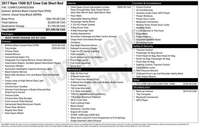 17" x 7" Aluminum Wheels, ParkView Rear Back-Up Camera, Quick Order Package 22G SLT, Speed control, 3.21 Rear Axle Ratio, 32 Gallon Fuel Tank, 4-Wheel Disc Brakes, 40/20/40 Split Bench Seat, 6 Speakers, ABS brakes, Active Grille Shutters, Air Conditioning, Alloy wheels, AM/FM radio, Audio Jack Input for Mobile Devices, Black Exterior Mirrors, Black Rotary Shifter, Brake assist, Bumpers: chrome, Center Hub, Charge Only Remote USB Port, Cloth 40/20/40 Bench Seat, Compass, Delay-off headlights, Driver door bin, Dual front impact airbags, Dual front side impact airbags, Electronic Shift, Electronic Stability Control, Exterior Mirrors w/Heating Element, Fog Lamps, Front anti-roll bar, Front Armrest w/3 Cupholders, Front Center Armrest w/Storage, Front reading lights, Front wheel independent suspension, Fully automatic headlights, GPS Antenna Input, Heated door mirrors, Illuminated entry, Integrated Voice Command w/Bluetooth, Low tire pressure warning, Media Hub (USB, AUX), Occupant sensing airbag, Outside temperature display, Overhead airbag, Overhead console, Panic alarm, Passenger door bin, Passenger vanity mirror, Power door mirrors, Power steering, Power windows, Radio data system, Radio: Uconnect 3 w/5" Display, Rear anti-roll bar, Rear seat center armrest, Rear step bumper, Remote keyless entry, Remote USB Port, Storage Tray, Tachometer, Tilt steering wheel, Tip Start, Traction control, Trip computer, Variably intermittent wipers, Voltmeter, 17" x 7" Aluminum Wheels, ParkView Rear Back-Up Camera, Quick Order Package 22G SLT, Speed control.