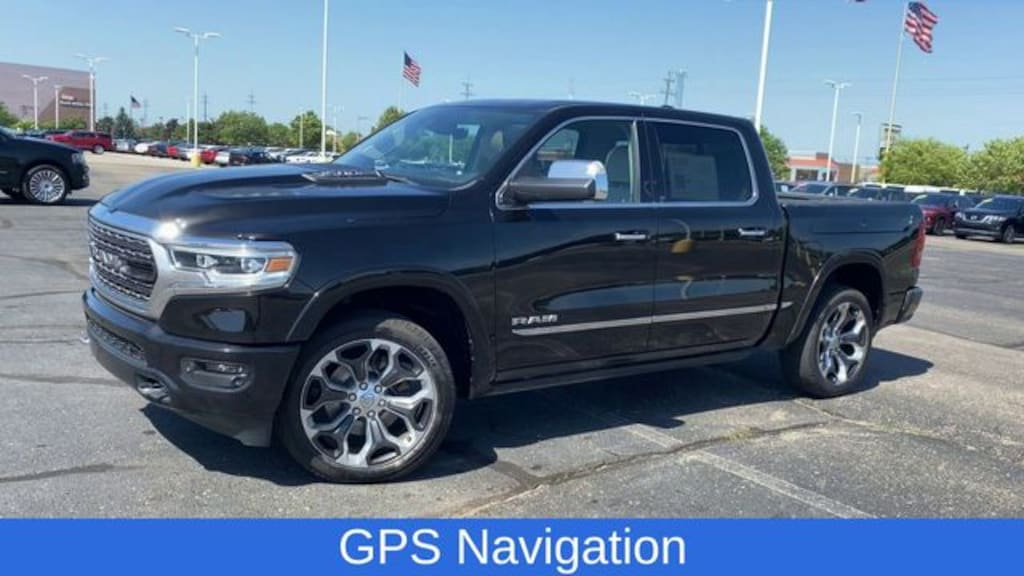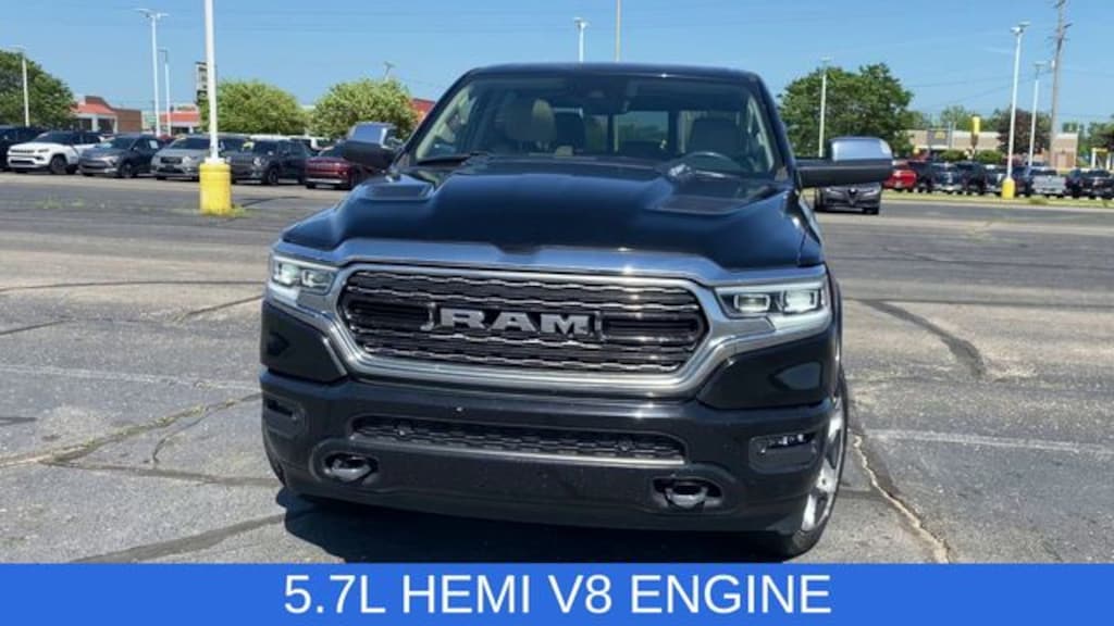 HEMI 5.7L V8 Multi Displacement VVT, 4 Adjustable Cargo Tie-Down Hooks, Adaptive Cruise Control w/Stop & Go, Advanced Brake Assist, Apple CarPlay, Bed Utility Group, Dome Dual LED Reading Lamp, Dual-Pane Panoramic Sunroof, Full Speed Forward Collision Warning Plus, GPS Navigation, harman/kardon 19 Speaker Premium Sound, Heated front seats, Lane Keep Assist, LED Dome/Reading Lamp, Limited Level 1 Equipment Group, Navigation System, Parallel & Perp Park Assist w/Stop, ParkView Rear Back-Up Camera, Pick-Up Box Lighting, Power Chrome Trailer Tow Mirrors, Quick Order Package 27M Limited, RamBox Cargo Management System, Trailer Brake Control, Trailer Tow Group, Trailer Tow Mirrors, Ventilated Rear Seats, Wheels: 22" x 9" Polish/Painted w/Inserts, 1-Yr SiriusXM Guardian Trial, 10 Speakers, 12" Touchscreen Display, 3.21 Rear Axle Ratio, 33 Gallon Fuel Tank, 4-Wheel Disc Brakes, 48V Belt Starter Generator, ABS brakes, Adjustable pedals, Air Conditioning, Alloy wheels, AM/FM radio: SiriusXM with 360L, Anti-Spin Differential Rear Axle, Apple CarPlay/Android Auto, Audio memory, Auto High-beam Headlights, Auto-dimming door mirrors, Auto-dimming Rear-View mirror, Auto-leveling suspension, Automatic temperature control, Body Color Bumper Group, Body Color Rear Bumper w/Step Pads, Bodyside moldings, Brake assist, Bumpers: chrome, Compass, Delay-off headlights, Disassociated Touchscreen Display, Driver door bin, Driver vanity mirror, Dual front impact airbags, Dual front side impact airbags, Electronic Stability Control, Emergency communication system: SiriusXM Guardian, Front anti-roll bar, Front Bucket Seats, Front Center Armrest w/Storage, Front dual zone A/C, Front fog lights, Front reading lights, Front wheel independent suspension, Fully automatic headlights, Garage door transmitter, Genuine wood console insert, Genuine wood dashboard insert, Genuine wood door panel insert, Google Android Auto, GPS Antenna Input, HD Radio, Heated door mirrors, Heated rear seats, Heated steering wheel, Illuminated entry, Integrated Center Stack Radio, Leather steering wheel, Low tire pressure warning, Manufacturer's Statement of Origin, Memory seat, Occupant sensing airbag, Outside temperature display, Overhead airbag, Overhead console, Panic alarm, Passenger door bin, Passenger vanity mirror, Pedal memory, Power door mirrors, Power driver seat, Power passenger seat, Power steering, Power windows, Premium Leather Trimmed Bucket Seats, Radio data system, Radio: Uconnect 12 w/Navigation, Rain sensing wipers, Rear anti-roll bar, Rear seat center armrest, Rear step bumper, Rear window defroster, Remote CD player, Remote keyless entry, Security system, SiriusXM Satellite Radio, SiriusXM Traffic Plus, SiriusXM Travel Link, SiriusXM w/360L, Speed control, Split folding rear seat, Steering wheel mounted audio controls, Tachometer, Telescoping steering wheel, Tilt steering wheel, Traction control, Trip computer, Turn signal indicator mirrors, USB Host Flip, Variably intermittent wipers, Ventilated front seats, Voltmeter, Wheels: 20" x 9" Polished w/Inserts, Clean Carfax, 5.7L HEMI V8 ENGINE, HEMI 5.7L V8 Multi Displacement VVT, 4 Adjustable Cargo Tie-Down Hooks, Adaptive Cruise Control w/Stop & Go, Advanced Brake Assist, Apple CarPlay, Bed Utility Group, Dome Dual LED Reading Lamp, Dual-Pane Panoramic Sunroof, Full Speed Forward Collision Warning Plus, GPS Navigation, harman/kardon 19 Speaker Premium Sound, Heated front seats, Lane Keep Assist, LED Dome/Reading Lamp, Limited Level 1 Equipment Group, Navigation System, Parallel & Perp Park Assist w/Stop, ParkView Rear Back-Up Camera, Pick-Up Box Lighting, Power Chrome Trailer Tow Mirrors, Quick Order Package 27M Limited, RamBox Cargo Management System, Trailer Brake Control, Trailer Tow Group, Trailer Tow Mirro