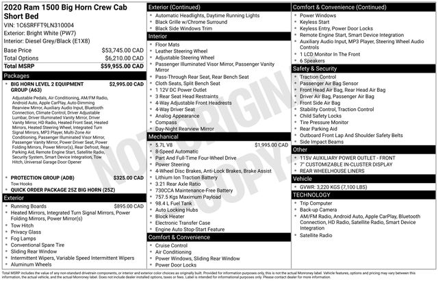 115V Auxiliary Power Outlet, 115V Auxiliary Rear Power Outlet, 2 USB Full Function/Charge Only Media Hub, 2nd Row In Floor Storage Bins, 400W Inverter, Air Conditioning ATC w/Dual Zone Control, Auto-Dimming Rear-View Mirror, Big Horn Badge, Big Horn IP Badge, Big Horn Level 2 Equipment Group, Black Premium Power Mirrors, Class IV Receiver Hitch, Dampened Tailgate, Foam Bottle Insert (Door Trim Panel), Glove Box Lamp, Heated Front Seats, Heated Steering Wheel, ParkSense Front/Rear Park Assist w/Stop, ParkView Rear Back-Up Camera, Power 4-Way Driver Lumbar Adjust, Power 8-Way Driver Seat, Power Adjustable Pedals, Protection Group, Quick Order Package 25Z Big Horn, Radio: Uconnect 4 w/8.4" Display, Rear Dome w/On/Off Switch Lamp, Rear Power Sliding Window, Rear Window Defroster, Remote Start System, Security Alarm, SiriusXM Satellite Radio, Speed control, Sun Visors w/Illuminated Vanity Mirrors, Tow Hooks, Universal Garage Door Opener, 3 Rear Seat Head Restraints, 3.21 Rear Axle Ratio, 4 Way Front Headrests, 4-Wheel Disc Brakes, 48V Belt Starter Generator, 6 Speakers, ABS brakes, Air Conditioning, Alloy wheels, AM/FM radio, Brake assist, Bumpers: chrome, Cloth Bench Seat, Compass, Delay-off headlights, Driver door bin, Dual front impact airbags, Dual front side impact airbags, Electronic Stability Control, Front anti-roll bar, Front Center Armrest w/Storage, Front fog lights, Front reading lights, Front Seat Back Map Pockets, Front wheel independent suspension, Fully automatic headlights, GPS Antenna Input, Heated door mirrors, Illuminated entry, Leather steering wheel, Low tire pressure warning, Occupant sensing airbag, Outside temperature display, Overhead airbag, Overhead console, Panic alarm, Passenger door bin, Passenger vanity mirror, Power door mirrors, Power steering, Power windows, Radio data system, Radio: Uconnect 3 w/5" Display, Rear 60/40 Folding Seat, Rear anti-roll bar, Rear seat center armrest, Rear step bumper, Rear Wheelhouse Liners, Remote keyless entry, Split folding rear seat, Steering wheel mounted audio controls, Tachometer, Telescoping steering wheel, Tilt steering wheel, Traction control, Trip computer, Variably intermittent wipers, Voltmeter, Wheel to Wheel Side Steps, Wheels: 18" x 8" Cast-Aluminum Painted, Clean Carfax, 5.7L HEMI V8, 115V Auxiliary Power Outlet, 115V Auxiliary Rear Power Outlet, 2 USB Full Function/Charge Only Media Hub, 2nd Row In Floor Storage Bins, 400W Inverter, Air Conditioning ATC w/Dual Zone Control, Auto-Dimming Rear-View Mirror, Big Horn Badge, Big Horn IP Badge, Big Horn Level 2 Equipment Group, Black Premium Power Mirrors, Class IV Receiver Hitch, Dampened Tailgate, Foam Bottle Insert (Door Trim Panel), Glove Box Lamp, Heated Front Seats, Heated Steering Wheel, ParkSense Front/Rear Park Assist w/Stop, ParkView Rear Back-Up Camera, Power 4-Way Driver Lumbar Adjust, Power 8-Way Driver Seat, Power Adjustable Pedals, Protection Group, Quick Order Package 25Z Big Horn, Radio: Uconnect 4 w/8.4" Display, Rear Dome w/On/Off Switch Lamp, Rear Power Sliding Window, Rear Window Defroster, Remote Start System, Security Alarm, SiriusXM Satellite Radio, Speed control, Sun Visors w/Illuminated Vanity Mirrors, Tow Hooks, Universal Garage Door Opener.