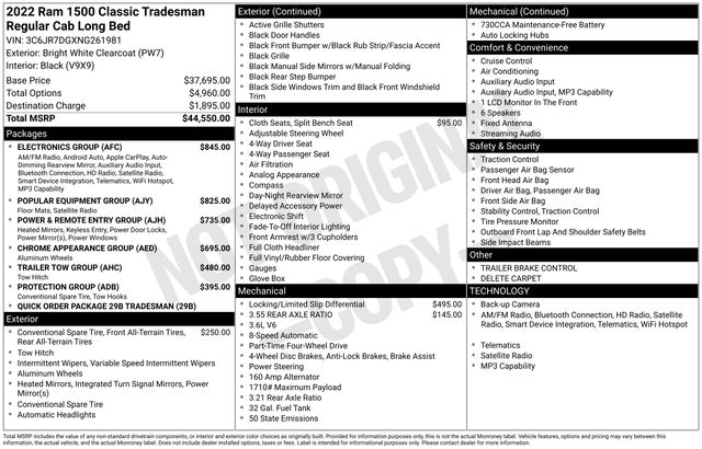 4G LTE Wi-Fi Hot Spot, 8.4" Touchscreen Display, Apple CarPlay, Audio Input Jack for Mobile Devices, Auto-Dimming Rear-View Mirror, Class IV Receiver Hitch, Cluster 7.0" TFT Color Display, Electronics Group, Folding Trailer Tow Mirrors, Google Android Auto, GPS Antenna Input, Integrated Center Stack Radio, Integrated Voice Command w/Bluetooth, Media Hub (2 USB, AUX), Radio: Uconnect 5 w/8.4" Display, Remote USB Port, SiriusXM Guardian - Included Trial (B), SiriusXM Satellite Radio, Trailer Brake Control, Trailer Tow Group, USB Host Flip, 1 Year Trial (Registration Required), 17" x 7" Aluminum Wheels, 17" x 7" Steel Wheels, 4-Wheel Disc Brakes, 40/20/40 Split Bench Seat, 6 Speakers, ABS brakes, Active Grille Shutters, Air Conditioning, AM/FM radio, Anti-Spin Differential Rear Axle, Black Exterior Mirrors, Brake assist, Bright Front Bumper, Bright Grille, Bright Rear Bumper, Carpet Floor Covering, Center Hub, Chrome Appearance Group, Cloth 40/20/40 Bench Seat, Compass, Delay-off headlights, Driver door bin, Dual front impact airbags, Dual front side impact airbags, Electronic Shift, Electronic Stability Control, Engine Calibration Flash, V2, Exterior Mirrors Courtesy Lamps, Exterior Mirrors w/Heating Element, Exterior Mirrors w/Supplemental Signals, For Details Visit DriveUconnect.com, Front anti-roll bar, Front Armrest w/3 Cupholders, Front Center Armrest, Front Floor Mats, Front wheel independent suspension, Fully automatic headlights, Global Telematics Box Module (TBM), Heavy Duty Vinyl 40/20/40 Split Bench Seat, Low tire pressure warning, Manual Adjust Seats, No Satellite Coverage HI/AK/PR/VI/GU, Occupant sensing airbag, Outside temperature display, Overhead airbag, Overhead console, ParkView Rear Back-Up Camera, Passenger door bin, Popular Equipment Group, Power & Remote Entry Group, Power Black Trailer Tow Mirrors (DISC), Power Heated Fold-Away Mirrors, Power Locks, Power steering, Power Windows w/Front 1-Touch Down, Premium Vinyl Door Trim w/Map Pocket, Protection Group, Quick Order Package 29B Tradesman, Radio data system, Radio: Uconnect 3 w/5" Display, Rear anti-roll bar, Rear step bumper, Remote Keyless Entry w/All-Secure, Rotary Shifter-Black, Speed control, Tachometer, Tilt steering wheel, Tip Start, Tow Hooks, Traction control, Tradesman Package, Trailer Tow Mirrors, Variably intermittent wipers, Voltmeter, 4G LTE Wi-Fi Hot Spot, 8.4" Touchscreen Display, Apple CarPlay, Audio Input Jack for Mobile Devices, Auto-Dimming Rear-View Mirror, Class IV Receiver Hitch, Cluster 7.0" TFT Color Display, Electronics Group, Folding Trailer Tow Mirrors, Google Android Auto, GPS Antenna Input, Integrated Center Stack Radio, Integrated Voice Command w/Bluetooth, Media Hub (2 USB, AUX), Radio: Uconnect 5 w/8.4" Display, Remote USB Port, SiriusXM Guardian - Included Trial (B), SiriusXM Satellite Radio, Trailer Brake Control, Trailer Tow Group, USB Host Flip.